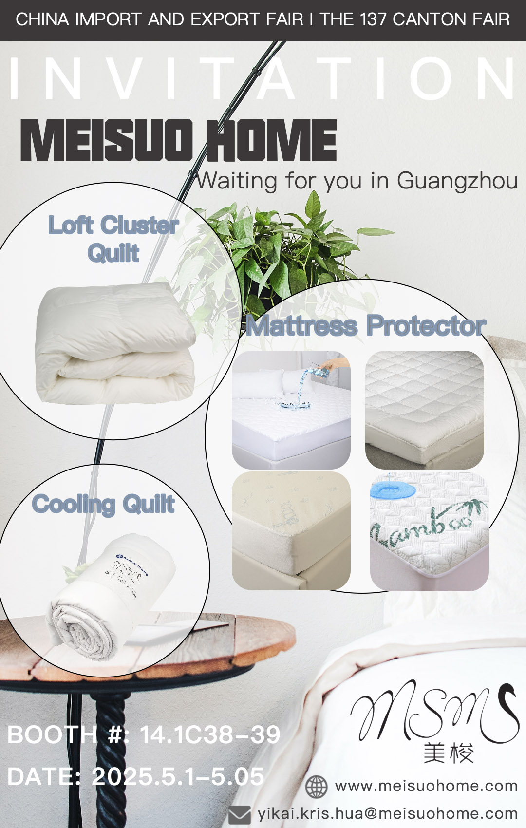 We are excited to announce that Meisuo Home will be exhibiting at the 137th Canton Fair (May 1-5, 2025)! As a specialist in high-quality filled bedding products, we invite you to visit our booth 14.1C38-39 to discover our premium range of mattress protectors, duvets, pillows, and other filled bedding essentials.